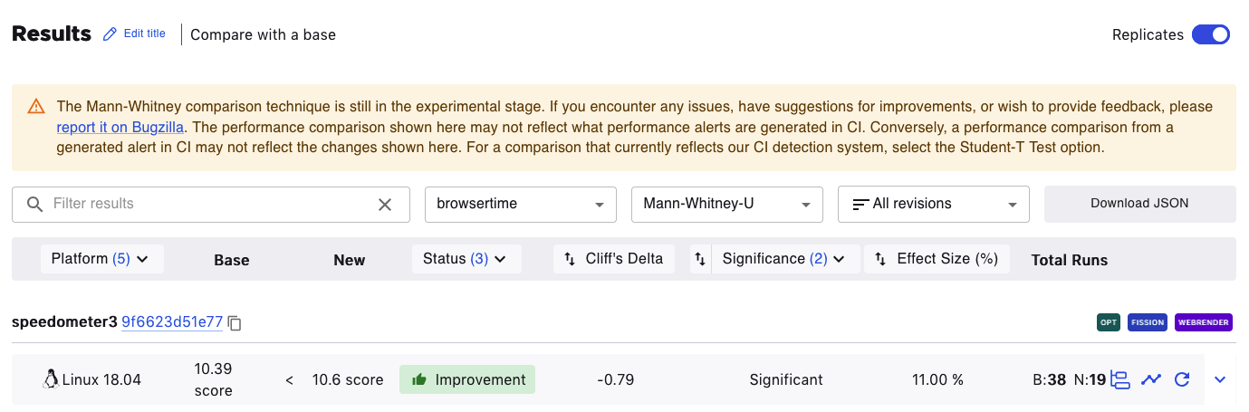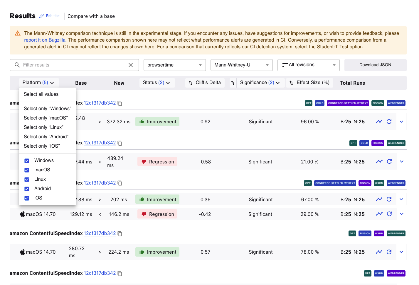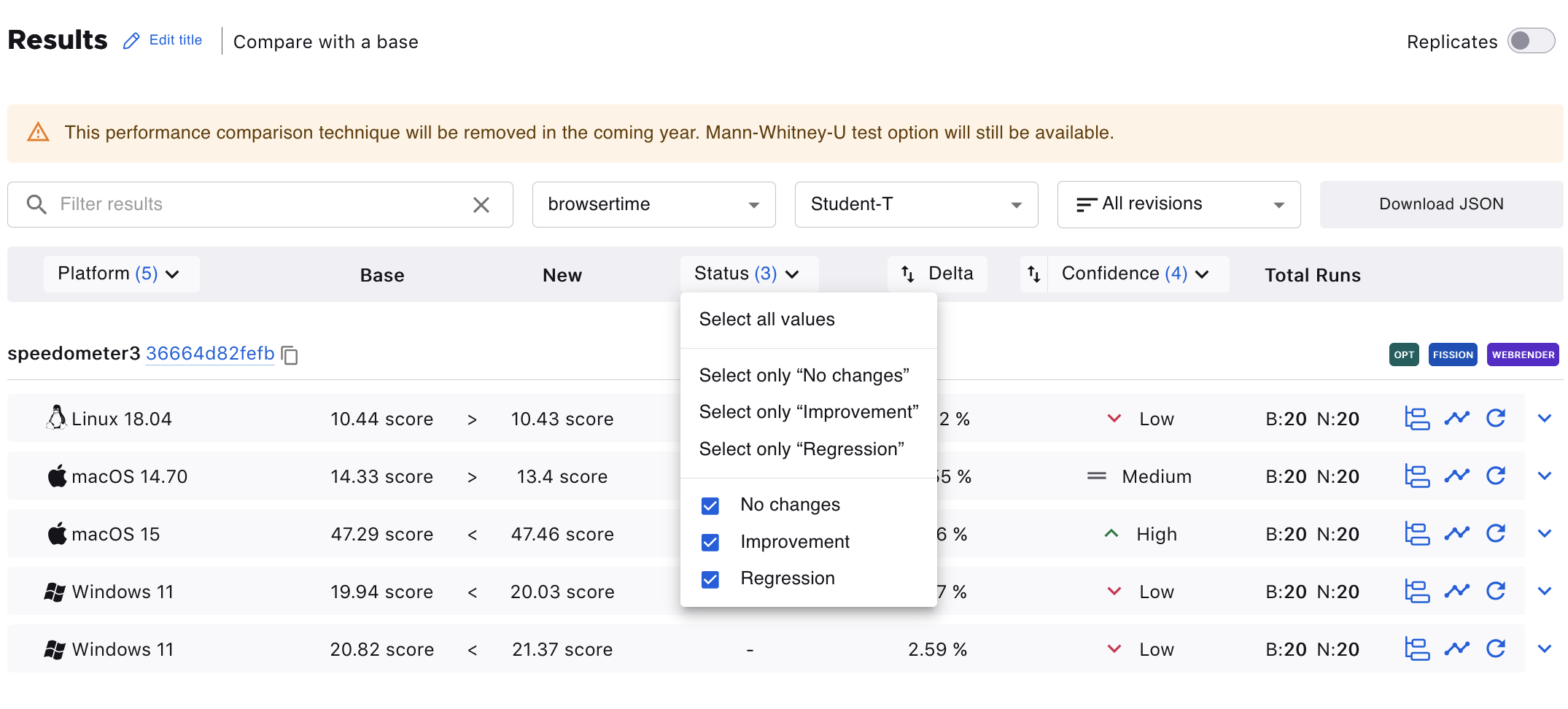 The results table can be filtered according to Platforms, Status (No Changes, Improvement, or Regression), or Confidence (Low, Medium, High).