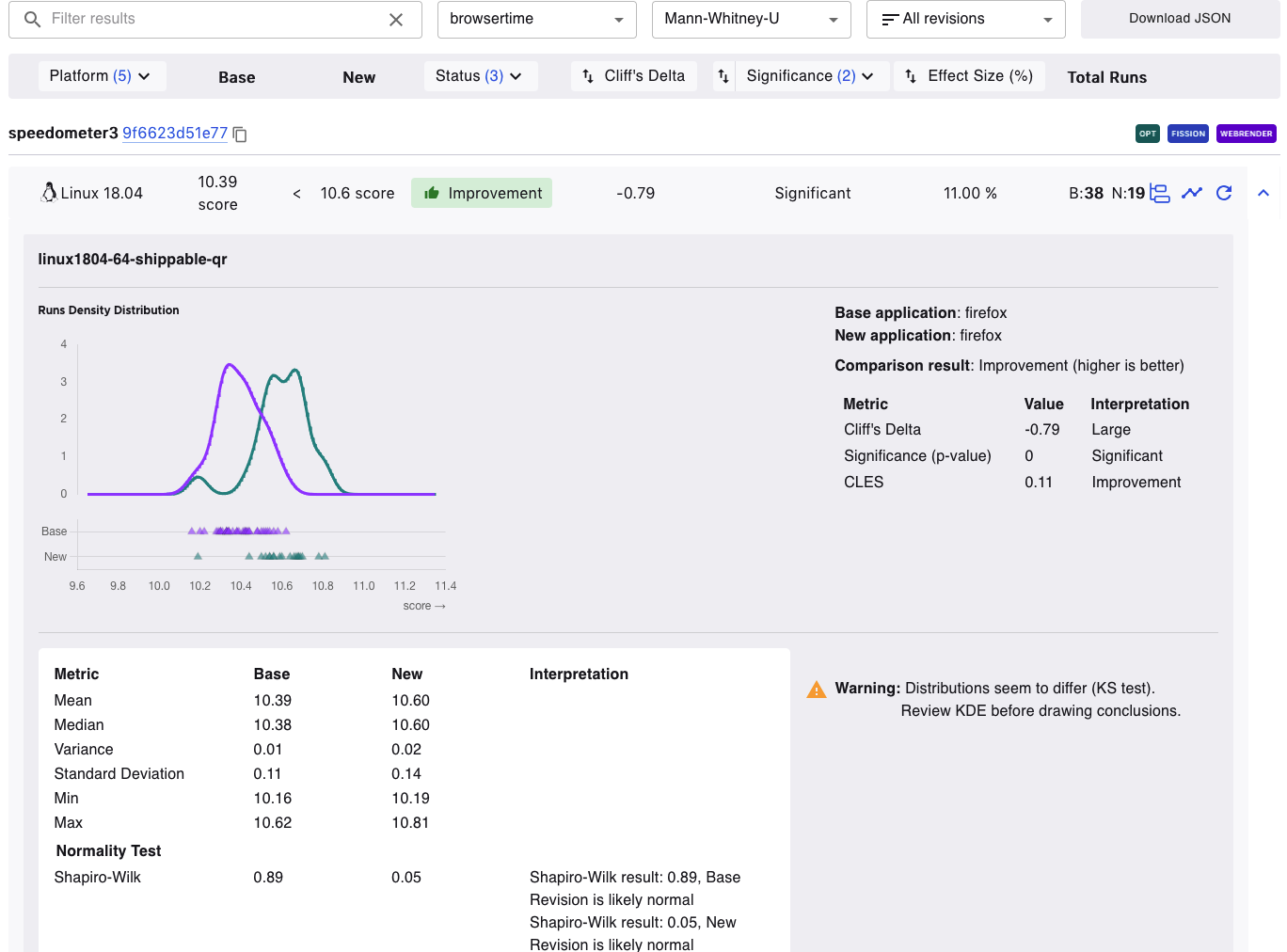 Cliff’s Delta measures the magnitude of the difference between the Base and New values by providing a standardized, unitless metric. For example, in the image below, the Cliff’s Delta is -0.79. This means it is a large effect (anything beyond ±0.47 is considered a large difference). The negative value means a New value is consistently larger than a Base value.