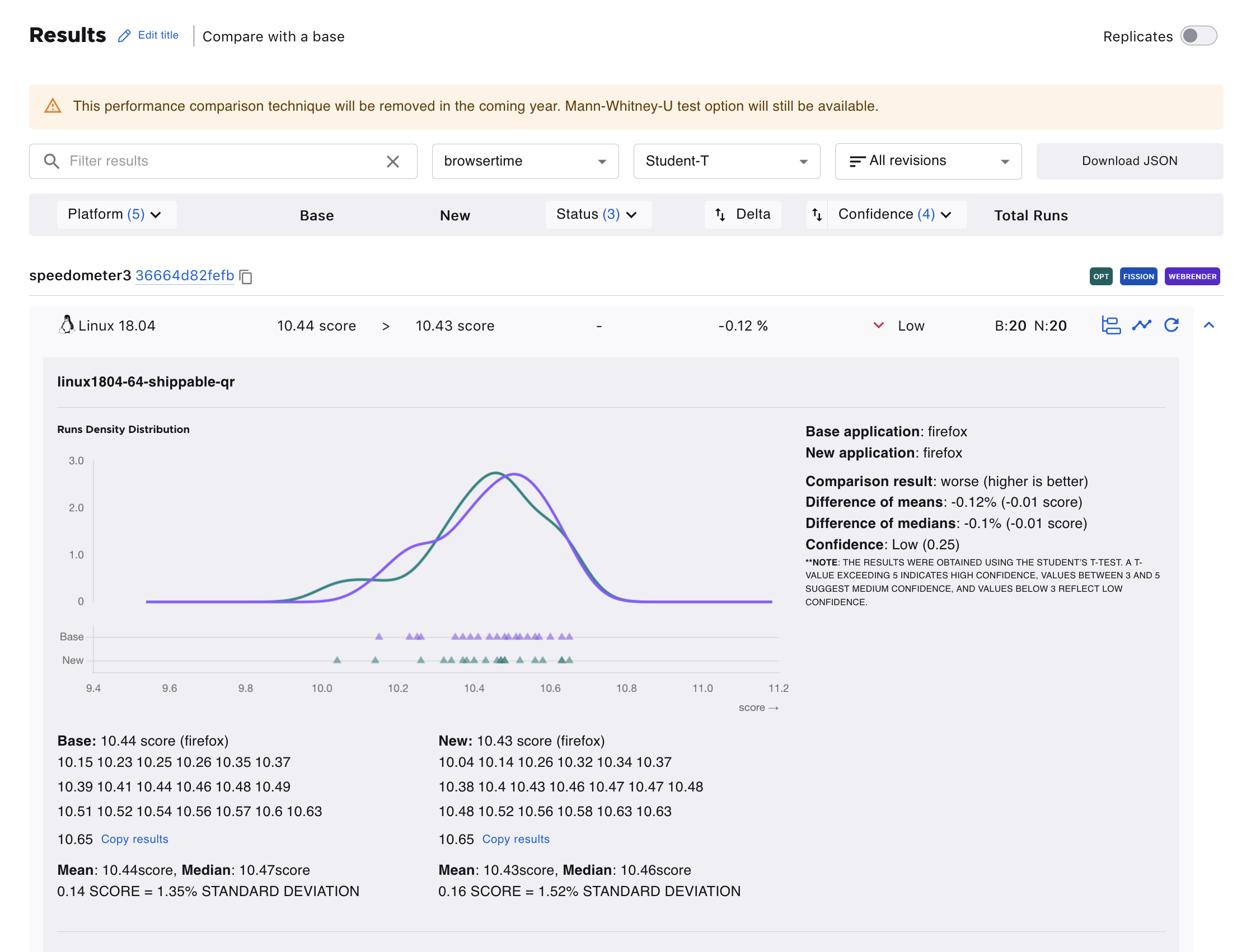 The default statistical technique for PerfCompare is Mann-Whitney-U, recently changed from Student-T, which is still available for selection in the test version dropdown. Student-T will be removed from the platform in the coming year.